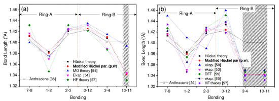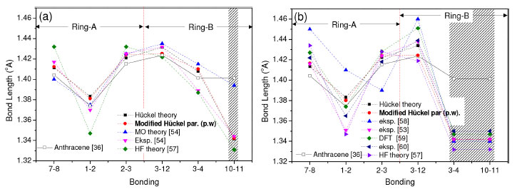 ![]() Figure 4. Bond length of (a) acridine and (b) phenazine from the present work with the best result for the modified Hückel parameters, compared with the data for anthracene36 and experimental and computational data from previous studies.53,54,57-60 Shading denotes CN bonding