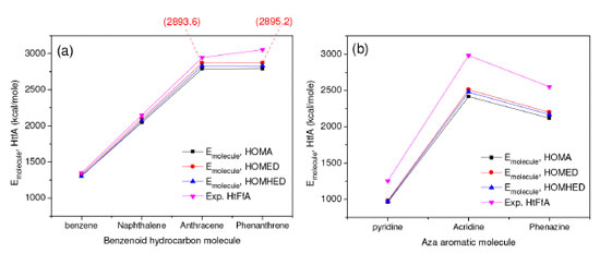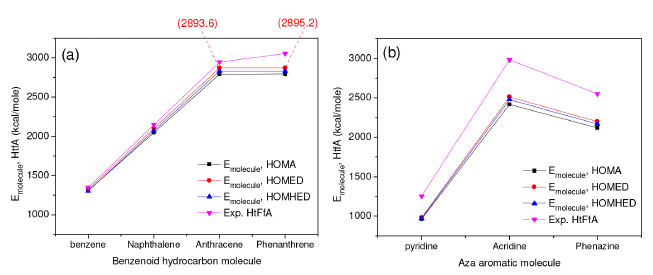 ![]() Figure 5. Total molecular energy based on HOMA, HOMED and HOMHED calculations compared with the experimental HtFfA for (a) benzenoid hydrocarbon and (b) aza aromatic molecules. The numbers on (a) are Emolecule of anthracene and phenantrene calculated based on HOMED