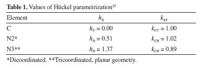 I. Department of Physics, Faculty of Mathematics and Natural Sciences, Institut Teknologi Bandung, 40132 Bandung, Indonesia Recebido em: 14/10/2022 *e-mail: im_sutjahja@itb.ac.id Hückel theory is a simple and powerful method for predicting the molecular orbital and the energy of conjugated molecules. However, the presence of nitrogen atoms in aza aromatic molecules alters the Coulomb and resonance integrals owing to the difference in electronegativity between nitrogen and carbon atoms. In this study, we focus on acridine and phenazine. Further correction is implemented based on the ring current model, thus revealing the change in resonance integral for the carbon-carbon bond along the bridge of the molecule. The Hamiltonian of the π-electron system in the Hückel method is solved using the HuLiS software. Various geometry-based aromaticity indices are used to obtain the aromaticity indices of the two non-equivalent rings. For further evaluation, the results for bond lengths are used to calculate the associated bond energy. Considering the carbon-hydrogen (CH) bonds, the total molecular energy is compared with the experimental heats of formation for a number of benzenoid hydrocarbons and aza aromatics, in addition to the two studied molecules. Finally, the correlation between the nitrogen atom on the aromaticity index and the ring energy content is evaluated to determine to which extent the Hückel model agrees with previous experimental and advanced computational studies. INTRODUCTION Polycyclic π-conjugated carbon-based molecules have numerous potential applications in organic electronics; therefore, a detailed understanding of their fundamental properties is crucial.1 Doping heteroatoms into carbon-based molecules is an effective strategy to adjust their physical and chemical properties of the material, thereby improving their performance in electronic, photonic, optoelectronic, and spintronic applications.2-11 Nitrogen is the most commonly used dopant as it has a similar covalent radius as carbon while providing one extra electron. A fundamental property of heteroatom-doped carbon-based molecules is their stability with respect to the control of energy levels, which can be measured by the energy gap (Egap). Aromaticity is related to stability and Egap, and it has been a central concept in organic chemistry for over a century.12 Among the numerous aromaticity indices,13,14 a geometry-based aromaticity index is the most simple, successful, and widely used to quantitatively describe the π-electron delocalization in homoand hetero-atomic molecules. Starting from the harmonic oscillator model of aromaticity (HOMA),15-17 the model was developed for the harmonic oscillator model of electron delocalization (HOMED)18,19 and the harmonic oscillator model of heterocyclic electron delocalization (HOMHED).20 These aromaticity indices use bond length data from molecular geometry, and the uniformity of π-electron distribution in the molecule is associated with the equalization of bond lengths. To calculate the aromaticity index, each of the three models uses some reference molecules or their related hybridizations to measure the optimal bond length from the single bond, Rs, and the double bond, Rd. Hückel molecular orbital (HMO) theory is a well-known, simple theory, easily understood by undergraduate students, to predict Egap and the behavior of the π-electron system.21-23 The HMO theory uses only the topology of the molecule, is independent of structural parameters, such as bond lengths and bond angles, and ignores the strain energy. For the heteroatoms, the Coulomb and resonance integral parameters can be adjusted according to the atom type and coordination number. These parameterizations are due to the different core energies of the heteroatom and the change in the effective electronegativity, compared with carbon, of the remaining non-bonded p orbitals at the center. Although the parameterizations are standardized in numerous chemistry and physics textbooks, the importance of distinguishing the Coulomb parameter of carbon atoms adjacent to heteroatoms is rarely emphasized. This is so particular for nitrogen-containing molecules, due to the large electronegativity of nitrogen.24,25 This parameterization should also depend on the molecule, which would require an additional parameter to measure the accuracy of the parameterization. Pauling26 established a formula relating bond length to bond order and an empirical rule for the relation between bond order and bond energy;27 subsequently, Krygowski developed a model to estimate bond energy from bond length data.28 Summation of the bond energy over all bonds of a cyclic molecule provides the ring energy content (REC), and summation over the entire molecule provides the molecule energy content (MEC).29 Considering the CH bond energy, one may obtain the total molecular energy and compare it with the experimental data for the heat of formation.28 Krygowski28 and Cyrański30 reported that the local and global aromaticity index of the HOMA correlates well with REC and MEC, with a higher mutual correlation for angular polyacenes compared with linear systems. However, the analyses so far are limited to benzenoid hydrocarbon molecules, leaving some questions regarding heteroatom molecules, including aza aromatic molecules. This study applied a variation in the Hückel parameters of the aza aromatic molecules, acridine and phenazine. Previous theoretical studies have shown that the carbon atom adjacent to nitrogen should have a different Coulomb parameter owing to the large electronegativity of nitrogen.24,25 However, the variation applied is not systematic, and generalization for its dependence on molecules is unclear.31 A further correction was performed based on the ring current model, which describes the flow of the π-electron system along the molecule's perimeter due to delocalization,32,33 as in the case of aromatic hydrocarbon molecules.34,35 T