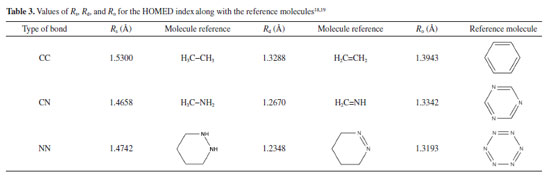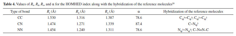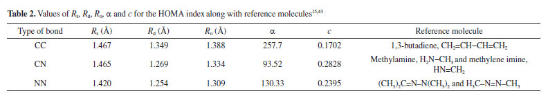The α calculation follows the following rules. For molecules with even numbers of bonds (2i), α can be calculated using Equation (13). In contrast, for molecules with odd numbers of bonds (2i + 1), α can be calculated using Equations (15) and (16), each of them for (i + 1) single bonds and (i) double bonds, and (i) single bonds, and (i + 1) double bonds. ![]() ![]() The HOMHED model proposed by Frizzo et al.20 in 2012 is based on the average experimental (X-ray diffraction and neutron diffraction) data of several reference molecules. Table 4 presents the Rs, Rd, Ro, and α values for the HOMHED calculation, along with the hybridization of the reference molecules for a particular type of bonding. The HOMHED index was calculated using Equation (11).
