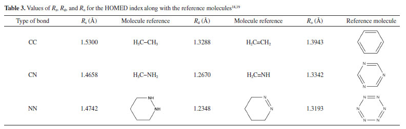In Equation (11), it is clear that the decreased aromaticity in the π-electron system can be described by two different and independent mechanisms, namely, an increase in the bond length alternation (GEO) and an extension of the mean bond length (bond elongation) (EN); the latter is due to a decrease in the resonance energy. These two dearomatization terms, i.e., geometric GEO and energetic EN contributions, are calculated by transforming the bond order of CX or XY bonds. This is derived from Equation (9) considering the virtual CC bonds according to the Pauli formula (Equation (7)), ![]() such that ![]() where rav represents the average value of ri. The HOMED index was proposed by Raczyńska et al.18 in 2010, primarily for molecules that contain heteroatoms. The HOMED index is formally the same as that of the HOMA, Equation (11) but differs for the reference molecules. Herein, quantum-chemical methods were used to estimate the bond lengths using simple saturated systems for single bonds and simple unsaturated systems for double bonds. The optimal bond length, Ro, was chosen from various simple molecules for which equalization of the bonds occurs. Table 3 presents the Rs, Rd, and Ro values for the HOMED calculations, along with the reference molecules.