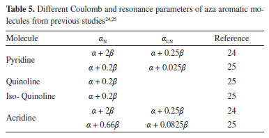 The output consists of the energy level and the coefficients of the linear combination of molecular orbitals. Additionally, this software can display the electron distribution profile for each energy level. Parametrization of Hückel parameters For various N-doped molecules of pyridine, quinoline, iso-quinoline, and acridine, Longuet-Higgins and Coulson in 194624 proposed the same correction to the Coulomb integrals of nitrogen and carbon atoms that directly bonded to nitrogen, whereas Dasgupta in 196425 proposed different parameter values that depend on the molecular type, as presented in Table 5. In this table, α is the Coulomb integral for all other carbon atoms and β is the resonance integral of the CC bonding.
