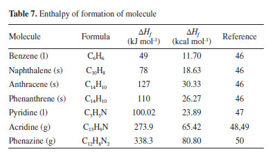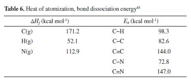 The data presented in Table 5 reveal a significant difference in the parameter values, whereas the commonly accepted values are listed in Table 1, without the need to give the difference for the carbon atom close to nitrogen. Herein, we performed a systematic study for the parametrization of the Hückel parameters of acridine and phenazine, which consist of the Coulomb integral of carbon adjacent to nitrogen (αCN) and the resonance integral for CC bonding (βCC) along the bridge of the molecule, expressed in terms of resonance energy,36 ![]() The values of αCN are 0, 0.025, 0.050, 0.075, 0.0825, 0.100, and 0.250; and 1.0 ≤ γ ≤ 1.5 with steps of 0.1. Bond energy and heat of atomization To compare the total bond energy and heat of formation from atoms, Table 6 lists the experimental data for the heat of atomization of C, H, and N from the gas phase and the bond dissociation energies of C-H, C-C, C=C, C-N, and C=N.45Table 7 lists the experimental data for the enthalpy of formation of the investigated molecules.