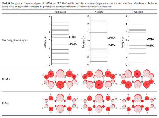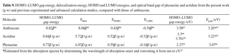 Evident from the molecular energy level diagram, degeneracy in the energy levels of acridine and phenazine was removed, which is consistent with a previous semi-empirical self-consistent field-LCAO-MO study.24 The HOMO and LUMO plots obtained resembled those obtained from the density functional theory (DFT) studies of Adad61 for acridine and Zendaoui59 for phenazine. The HOMO and LUMO plots for acridine and phenazine were similar to those of anthracene. In particular, the HOMO is localized primarily on the two C6 rings but extends to a certain degree to the central ring. In contrast, the LUMO is localized primarily on the central ring and presents a non-negligible contribution from the C6 rings. For acridine and phenazine, the essential contributor of the central ring is from the nitrogen atoms. Table 9 compares some of the energy characteristics of the two studied molecules with those of anthracene, compared with previous experimental and advanced calculation studies. This correction shows that the HOMO-LUMO gap energy was 0.84β for acridine and 0.77β for phenazine. In addition, the delocalization energy was 5.72β for acridine and 6.07β for phenazine. The higher gap energy of acridine relative to phenazine agrees with previous experiments and advanced computational studies. Compared with anthracene, the trend of the gap energy was consistent with the experimental optical band-gap data, and the gap energy decreased with increasing nitrogen to carbon ratio, which is in good agreement with a previous study.62 The delocalization energy of phenazine was found to be larger than acridine, which is in good agreement with the increased molecular stability when increasing the number of nitrogen atoms, but still smaller than the parent molecule anthracene.