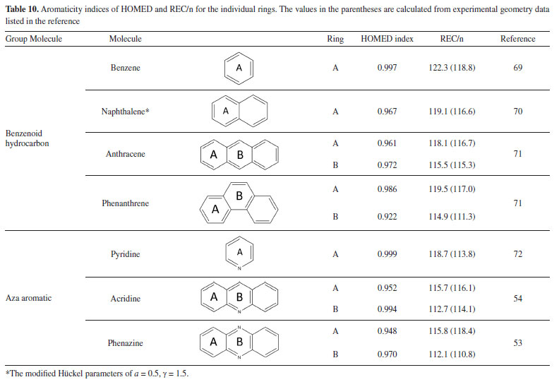According to Hückel theory, the molecular orbital ψ is formed from atomic orbital pi through a linear combination of atomic orbitals (LCAO) model, and the coefficients of atomic orbital {cni} can be further used to obtain the π-electron bond order: ![]() with νn is the number of π-electrons occupying the corresponding energy level. The energy gap is the difference between highest occupied molecular orbital (HOMO) level and the lowest unoccupied molecular orbital (LUMO) level, ![]() In addition, the delocalization energy is the difference between the total energies of the π-electron system and the simple isolated system. ![]() The isolated state of acridine (C13H9N) consists of six ethylene (C2H2) and one methane imine (CH3N), whereas phenazine (C12H8N2) consists of five ethylene and two methane imines.38 The energies of one molecule of ethylene and methane imine are 2(α + β) and 2α + 2.61β, respectively. Bond order and bond length correlation Pauling established a well-known formula relating the bond length R(p) to its bond order p as26 ![]() where c is an empirical constant and R(1) is the standard single bond length. The value of c can be calculated by taking the bond lengths for the typical single (p = l) and double (p = 2) bonds as follows: ![]() Using Equation (7), it is also possible to calculate the bond number, p, for any bond length, R(p), as follows: ![]() Focusing to Huckel theory that deals with π-electron system, the bond length can be calculated from the π-electron bond order following Gordy's formula:39,40 ![]() where a and b are the modified Gordy values, equal to 7.33 and 2.09 for CC bonding, and 6.52 and 2.03 for CN bonding, respectively;40 and N = 1 + ρij is the total bond order.39 Geometry-based aromaticity index The geometry-based aromaticity index of the HOMA13-17 is simple, successful, and widely used,41 both for homoand heteroatomic systems. Subsequently, the HOMED18,19 and HOMHED were developed.20 For each of these models, the bond length values for the single bond, Rs, and the double bond, Rd, were proposed according to the reference molecules. In general the HOMA index can be calculated as13-17,42,43 ![]() where n is the number of bonds taken into summation; and Rj,i is the experimental or computed bond length of the system for a certain type of bond (j). In Equation (11), the summation is also held for all types of bonds that are present in the ring of a molecule, that is, carbon-carbon (CC), carbon-nitrogen (CN), and nitrogen-nitrogen (NN) for the aza molecule. The optimal bond lengths Ro and α were calculated using the following formula. ![]() ![]() where w is the ratio of the stretching force constants for pure single (Rs) and double (Rd) bonds, and the common value is equal to 2 for CC and CX bonds.44 Table 2 presents the Rs, Rd, Ro, α, and c values for CC, CN, and NN bonds, and the reference molecule for each type of bond.