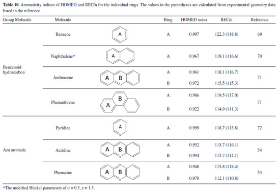 In general, the variation in the total molecular energy related to the three aromaticity indices followed the experimental HtFfA value. However, a smaller deviation was observed for the bond energies derived from the bond lengths based on the HOMED, followed by those derived from the HOMHED and HOMA. In particular, all models predicted a larger total molecular energy value for phenanthrene compared with anthracene, which is in agreement with the experimental HtFfA. Thus, the modified Hückel parameters yielded total molecular energy values that matched the experimental data. Compared with benzenoid hydrocarbon molecules, a larger deviation between the calculated total energy molecular and experimental HtFfA values was found for the aza aromatic molecules. To further correlate the bond energy with the aromaticity index, Table 10 presents the corresponding aromaticity HOMED index with the REC divided by the number of CC and CN bonds (n).