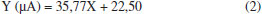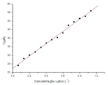 Um bom índice de correlação linear de 0,997 foi obtido através da regressão linear do gráfico do valor máximo da densidade de corrente versus a concentração de nitrito, variando de 0,0645 a 0,8 µmol L-1 (Figura 7). A equação de regressão linear correspondente é: ![]()