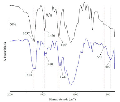![]() Figura 1. Espectroscopia na região do Infravermelho em pastilha de KBr para BS (preto) e BS/Cu (azul) na região de 2.000 a 400 cm-1