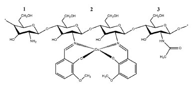 ![]() Figura 2. Proposta de unidades repetidoras da quitosana (1) e (3); (2) estrutura resultante da formação da base de Schiff com a incorporação do metal