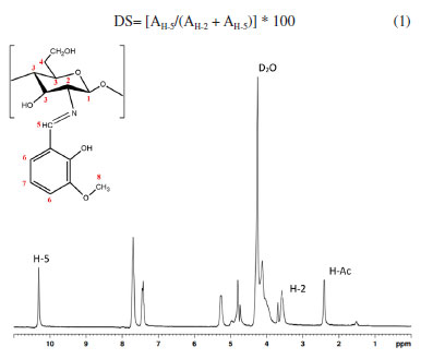 A estrutura química da BS sintetizada através da reação da quitosana com a OV foi confirmada através da espectroscopia de 1H RMN, Figura 3. Verifica-se no espectro a presença do sinal referente ao H-1 em 5,13 ppm, uma vez que este sofre desproteção através do efeito indutivo de ambos os oxigênios ligados diretamente ao carbono. Na região de 3,39 ppm observa-se o pico do H-2 pois, levando em consideração as características dos grupos substituintes do anel aromático, sabe-se que o grupo metoxila é um retirador de elétrons por indução mais significativo do que doador de elétrons por ressonância. Este irá proteger as posições orto e para do anel aromático, enquanto a hidroxila provocará o efeito protetor por ressonância sobre o próton ligado ao carbono na posição 7. Desta forma, atribuiu-se os sinais na região de 7,40 ppm a H-7 e 7,5 ppm ao H-6. Atribuiu-se ao pico em 4,02 ppm os hidrogênios presentes no grupo metóxi. Os sinais presentes nas regiões entre 4,72 e 4,16 ppm foram atribuídos aos hidrogênios presentes na cadeia polimérica. Além do mais, percebe-se um pico na região de 10,21 ppm correspondente ao núcleo de H referente ao grupo imina C=N caracterizando assim a reação entre a QT e a OV.