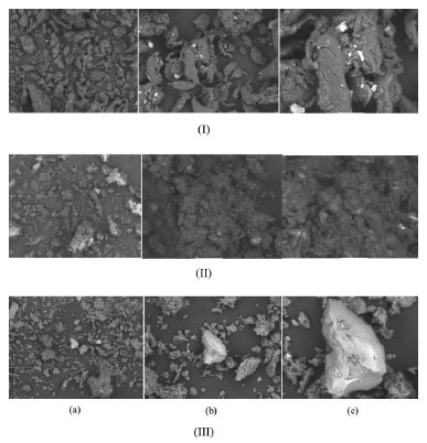 ![]() Figura 4. Imagens de microscopia eletrônica com ampliação: (a) 100 x 1 mm; (b) 300 x 300 µm e (c) 800 x 100 µm para a QT (I); BS (II) e BS-Cu (III)