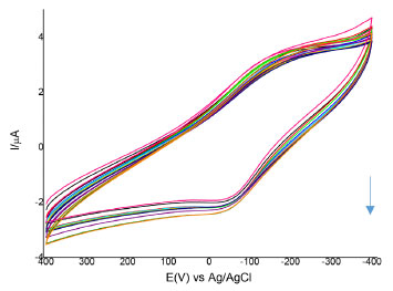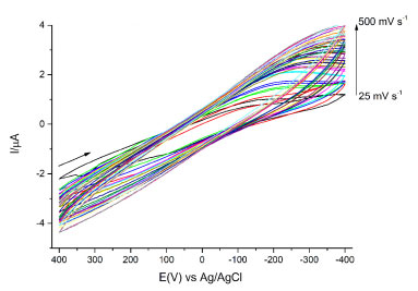![]() Figura 5. Voltametria cíclica de uma solução 1 mmol L-1 de K4[Fe(CN)6] em tampão fosfato 0,1 mol L-1, pH = 5 e com uma velocidade de varredura variando de 25 a 500 mV s-1