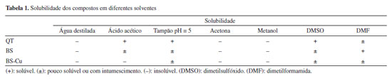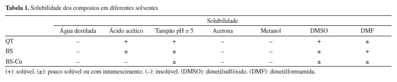 RESULTADOS E DISCUSSÃO Caracterização da base de Schiff (BS) e do complexo da base de Schiff (BS-Cu) O resultado da análise elementar para a quitosana purificada foi próximo a fórmula (C6H11O4N)n, sua unidade de repetição, quando se desconta o teor de água presente na amostra. A relação C/N da quitosana purificada apresentou um valor de 5,8, valor próximo ao relatado na literatura.42,43 Percebeu-se que a modificação provocou um aumento na razão C/N para a BS (9,4), este aumento também é relatado na literatura para outras bases de Schiff obtidas a partir da quitosana.42,43 O mesmo valor da relação C/N foi obtido para BS-Cu (9,4), o que era esperado, uma vez que não foi adicionado nenhuma molécula contendo carbono, hidrogênio e oxigênio. A solubilidade da quitosana (QT), da base de Schiff (BS) e do composto de coordenação (BS-Cu) formado foram testados em diferentes solventes e os resultados apresentados na Tabela 1. A quitosana é insolúvel em água e em solventes orgânicos, mas solúvel em ácido acético devido a protonação dos grupos -NH2 livres. A adição da orto-vanilina, originando a base de Schiff não altera o caráter hidrofílico da quitosana, como mostrado pela insolubilidade em acetona e metanol e a capacidade de intumescimento em DMSO. A diminuição da solubilidade em ácido acético deve-se a redução dos grupos -NH2 livres responsáveis pela sua protonação, provocando assim seu intumescimento. A adição do metal a base de Schiff dificultou ainda mais a solubilidade, uma vez que grande parte do material apenas intumesceu.