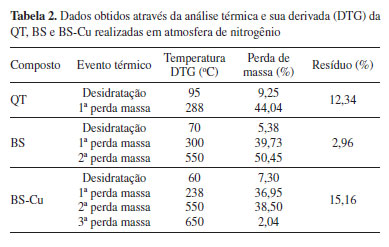 O grau de substituição (DS) obtido para BS foi de aproximadamente 42,5%, calculado usando a integração das áreas dos prótons do grupo imina H-5 e a próton do anel piranosídico H-2, de acordo com a seguinte equação:47 ![]() O espectro eletrônico da BS obtido em solução tampão fosfato, pH = 5,0 apresentou bandas em 213, 264 e 342 nm, relacionadas as transições eletrônicas do tipo π-π* do anel aromático50 orto-vanilina (OV). Percebe-se que essas bandas na BS apresentam um deslocamento hipsocrômico em relação a OV, devido a formação da ligação C=N na base de Schiff, que faz com que a densidade eletrônica no anel aromático seja deslocalizada por ressonância em uma forma menos energética. Além disso, a transição π-π*51 da ligação imínica C=N foi observada em 417 nm. Já o espectro eletrônico BS-Cu em solução tampão fosfato, pH = 5,0, possui as mesmas bandas identificadas na BS (216, 263, 341 e 420 nm) e uma nova banda em 788 nm atribuída a uma transição d-d do cobre. Complexos de cobre tendo como ligante a vanilina, podem apresentar três bandas d-d visíveis no espectro eletrônico,36 entretanto resultados de caracterização para compostos de coordenação com cobre formados a partir de BS só foi identificado uma única banda larga.27,46 O fato de somente identificar uma banda para estes compostos pode estar relacionado a proximidade entre as bandas, provocando uma sobreposição.52 O estudo de estabilidade térmica foi realizado para a QT, BS e BS-Cu em atmosfera de nitrogênio, a Tabela 2 mostra os dados de análise térmica e sua derivada (DTG). A QT apresentou uma perda de massa inicial próximo a 95 oC relacionada a perda de água com percentual de 9,25%, e um segundo evento foi observado devido à quebra da cadeia do polissacarídeo. A BS apresentou um percentual menor de umidade (5,58%) e uma maior estabilidade térmica quando comparada a QT purificada, foram identificados dois eventos relacionados a degradação do polissacarídeo. Este segundo pico de degradação é relacionado à emissão lenta de produtos voláteis, tais como CO e CO2.42 Com relação ao BS-Cu, a adição do metal parece ter diminuído a estabilidade térmica do material, observação semelhante ao relatado na literatura para outros compostos de coordenação formados a partir da BS.27,46,52 Com relação a degradação do material foram identificados três eventos, onde os dois primeiros referem-se à degradação do polissacarídeo, já o terceiro evento refere-se a quebra da ligação de coordenação entre o centro metálico e o nitrogênio.52 A quantidade de resíduo é maior devido a formação dos óxidos do metal que são termicamente estáveis.