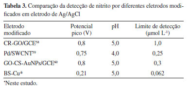 onde X é a concentração de nitrito, Y é a intensidade da corrente do pico de oxidação. A sensibilidade do eletrodo modificado é de 35 µmol L-1, obtida através da inclinação da reta, este valor é inferior ao relatado na literatura para determinação de nitrito utilizando outros composto de coordenação como eletrodo modificado.54-56 O limite de detecção (LD) é considerado como a menor concentração de um analito em uma amostra e pode ser determinada com o uso de diversas técnicas. Neste trabalho foi obtido tendo como base os dados extraídos da Figura 7, através da regressão linear e usando a seguinte equação:30,57 ![]() onde Sa corresponde à média do desvio padrão das medidas e b é o coeficiente angular da curva analítica. De forma semelhante, o limite de quantificação (LQ) foi determinado utilizando-se a equação:29,57 ![]() Os valores obtidos para LD e LQ do eletrodo formado BS-Cu foram de 0,062 µmol L-1 e 0,21 µmol L-1, respectivamente. O valor obtido para LD é inferior aos obtidos na literatura para detecção de nitritos utilizando eletrodos modificados (Tabela 3). Esse resultado demostra que o eletrodo produzido possui uma maior sensibilidade a presença de nitrito.
