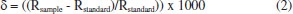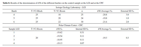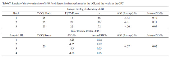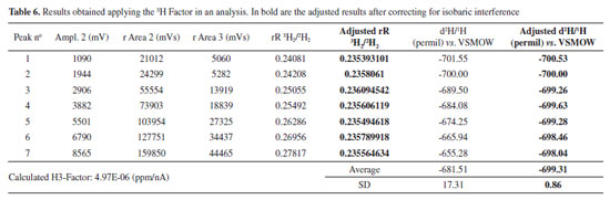 With a 3H Factor of 4.97 ppm mV-1, it was possible to reduce the standard deviation from 17.31 to 0.86 in the d2H/1H, showing the sensitivity and interference of 1H3+ (Table 6). The effect of ambient temperature Considering the importance of identifying parameters that affect the analysis of stable isotopes of oxygen and hydrogen in water, a ruggedness test was carried out with the objective of validating the methods of analysis assessing the stability of the IRMS, and the repeatability and reproducibility, as a function of ambient temperature. For that, an amount of Milli-Q water was separated and fractionated in 12 mL borosilicate tubes with a lid and silicone septum, labeled as LGI control sample. The tubes were completely filled (free from atmospheric air). Repeated determination of δ18O and δ2H of this sample were performed, with a total of six batches, labeled 1, 2, 3, 4, 5 and 6. The equipment manufacturer recommends that the ambient temperature where the analyzes are carried out should be 5 °C below the temperature of the autosampler tray (25 °C for O and H analysis). In order to verify the stability of the equipment and the ability of the autosampler tray to maintain a stable temperature during the analyses, the different batches were analyzed under different ambient temperature conditions. Batch 1 was set to 18 °C, 2 to 20 °C and 3 to 22 °C for oxygen analysis, and batch 4 to 18 °C, 5 to 20 °C and 6 to 22 °C, for hydrogen analysis. All batches of analyses were performed on the same equipment, same method and with the same operator. The ambient temperature was stabilized for a period of 24 hours before running the different batches. With the objective of evaluating the reproducibility of the analyses, four aliquots of the sample were also sent to the Laboratory of Stable Isotopes of the Polar Climate Center (CPC), so that different conditions of laboratory, equipment, operator, procedures, method, observer, instruments, conditions of use, location and time were analyzed. At the Polar Climate Center, located in Porto Alegre, data was also acquired by IRMS. The standards used in the experiment were ULW (δ18O = -4.33%VSMOW and δ2H = -25.37% VSMOW), Deplat (δ18O = -12.37%VSMOW and δ2H = -91.94% VSMOW), Brasília (δ18O = -3.37%VSMOW and δ2H = -13.92% VSMOW) and VSMOW (δ18O = 0.00%, δ2H = 0.00%). The delta values of the ULW, Deplat and Brasília standards were determined by the CPC and made available for this study.