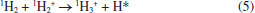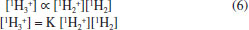 Isotope analysis of H2 by mass spectrometry is based on measuring the current of ions with mass 2 and 3, simultaneously. The mass 2 ion current is related to the 1H2+ species, while the mass 3 ion current is related to the 1H2H+ e 1H3+ species.2 The 1H3+ ion is also produced at the source through collisions between 1H2 and the 1H2+ ion according to the reaction below: ![]() The formation of 1H3+ is a consequence of the use of H2 (as reference gas) to carry out these measurements. In this case, the differentiation between the 1H3+ and 1H2H+ ions, both of mass 3, is not achieved, transforming the 1H3+ ion into an isobaric interference, requiring additional correction, since the signal of mass 3 m/z can be enriched by up to 30% (30 ppm mV-1) of 1H3+ produced at source. In conventional isotope ratio measurements, both the sample and the reference gas enter the ion source as H2. Ion source pressures are typically 10-6 mbar or less during these measurements and H2 is the only neutral species present in significant amounts. Under these conditions, collisions between 1H2 and the 1H2+ ion are the main source of 1H3+ ion production. Therefore, the concentration of 1H3+ is proportional to the product of the concentrations between 1H2+ and 1H2, according to the equation below:27 ![]() The proportionality constant (K) is commonly known as the 3H Factor.27 The K is determined by measuring the ratio of (mass 3)/(mass 2) ions in the reference gas in a given pressure range. After carrying out these measurements, at different pressures, and as the number of 1H3+ and 1H2+ ions are proportional to the pressure of H2 inside the ion source, the 3H Factor can be calculated. In practice, the procedure to calculate the 3H Factor is the acquisition of the hydrogen reference gas with pulses of different intensities generating the graph shown in Figure 1. From the resulting 3H2/2H2 ratio (mass area 3/mass area 2) for each pulse versus the 2H2+ signal intensity (mV), a linear regression can be performed (Figure 2) and the slope of the line is the 3H Factor.