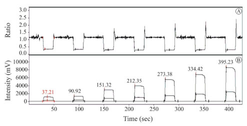 ![]() Figure 1. Typical values for 3H Factor determination. The graphic on top (A) shows the isotope ratio of masses 2 and 3 (3/2) over time; bottom graphic (B) shows the intensity (mV) of mass 2 and 3 signals over time varying the pressure of the reference gas H2, with the upper plateau being mass 2 and bottom plateau mass 3