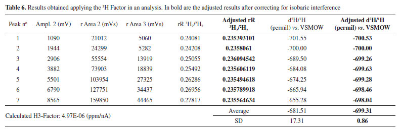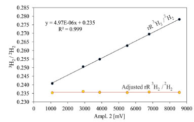 From the evaluation of the 3H2/2H2 versus mass 2 signal amplitude (Figure 2), coupled to the data in Table 6, it is possible to observe the increase in the precision of the analysis after using the 3H Factor. The black line in Figure 2 is a linear regression through the 3H2/2H2 data of the reference gas acquired at different pressures, used for calculating the 3H Factor. In Table 6, the R3H2/2H2 values corrected for isobaric interferences (1H3+) are shown, which represent more precise δ2H (d2H/1H) values. The red line in Figure 2 shows the same data points, but after applying the 3H Factor.