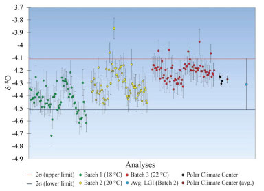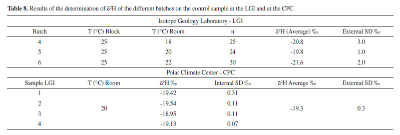 RESULTS The results for oxygen and hydrogen isotope determination in this study are presented in Appendix A and B (Supplementary Material), respectively. The average results for the determination of δ18O of the LGI control sample from different batches and the results of the CPC analysis, for reproducibility tests, are compiled in Table 7. Figure 3 shows the control chart of the δ18O analysis using data of this study.