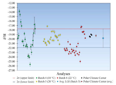 According to the results of this study, the average value of the analysis of batch 4 is close to the average value between the subsequent batches (5 and 6). However, it showed the highest external standard deviation (2.95%) compared to the other batches. The internal precision among the 10 pulses analyzed per run ranged from 0.30-1.18%. The values for δ2H of batch 5 showed an average of 1.01% more positive than the average value of batch 4, the smallest external standard deviation between batches (1.04%) and the average value closest to the average value of the batches aliquots analyzed by the CPC (δ2H = -19.26% ± 0.27%). The internal precision among the 10 pulses analyzed per run ranged between 0.12-0.38%. Results for the δ2H of batch 6 showed the most negative mean result among all batches (-21.61%) and an external standard deviation of 2.04%. The internal precision among the 10 pulses analyzed per run ranged from 0.17-0.52%. In a similar fashion to the δ18O, a control chart using the δ2H data of the control sample was drawn (Figure 4). Therefore, it was established that the δ2H value of the control sample is the representative value of the average batch 5 analysis, with the associated acceptable range of δ2H values. This range was established from the external precision data calculated from this batch at a 95% confidence interval (δ2Hbat. 5 average ± 2 sigma).18 Therefore, the reference value of the sample plus the confidence interval are δ2H = -19.8% ± 2.1% (Figure 4).