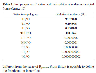 I. Instituto de Geociências, Universidade Federal do Rio Grande do Sul, 91500-000 Porto Alegre - RS, Brasil Recebido em: 22/08/2022 *e-mail: andre.martins@ufrgs.br Evaluation studies contribute to the identification of parameters that can affect the accuracy and precision of analytical methods. This study describes the analysis of δ18O and δ2H in water samples by the equilibrium method at the Isotope Geology Laboratory (LGI), Center for studies in Petrology and Geochemistry (CPGq) of the Federal University of Rio Grande do Sul (UFRGS). For that, six batches of analyzes were carried out under different ambient temperature conditions. For the reproducibility tests, four aliquots of the control sample were analyzed at the Polar Climate Center (CPC). Results showed that ambient temperature did not significantly affect the accuracy of the oxygen analysis. However, the mean result at 20 °C showed greater accuracy and acceptable precision. Hydrogen analyzes at a room temperature of 18 °C showed an external standard deviation and an internal precision exceeding the recommended, while at 20 and 22 °C the results were statistically acceptable, being the first more accurate. From that, it is possible to conclude that the determination of δ18O and δ2H in water at the LGI, employing the equilibrium method at an ambient temperature of 20 °C, showed satisfactory repeatability and reproducibility. INTRODUCTION There are three stable isotopes of oxygen and two stable isotopes of hydrogen in nature, 16O, 17O, 18O, 1H and 2H, so that there will be nine possible combinations for the formation of water molecules, called isotopologues.1 The mass variation of the isotopologues will be from 18 amu for 1H216O to 22 amu for 2H218O.2 The water species that are relevant to O and H stable isotope studies are: 1H216O, 1H217O, 1H218O and 1H2H16O (Table 1). The double or triple labeled water species (2H216O, 1H2H17O, 1H2H18O, 2H217O and 2H218O) are not relevant due to their low abundance in nature (Table 1).