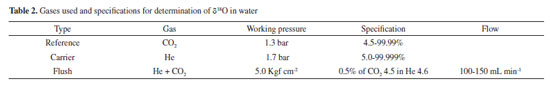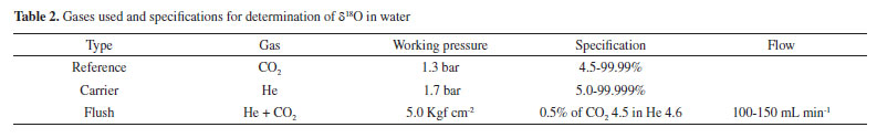MATERIALS AND METHODS Determination of δ18O in waters at the LGI For the δ18O determination in water samples, the method applied in this study involves the CO2 - H2O equilibrium and the equipment used is the Isotope Ratio Mass Spectrometry (IRMS) - Delta V Advantage - GasBench II, from Thermo Fisher Scientific®. Table 2 shows the specifications of purity, working pressure and gas flows used for the δ18O determination in water.