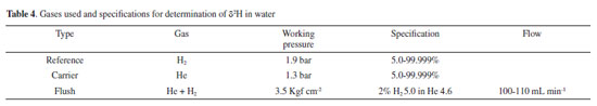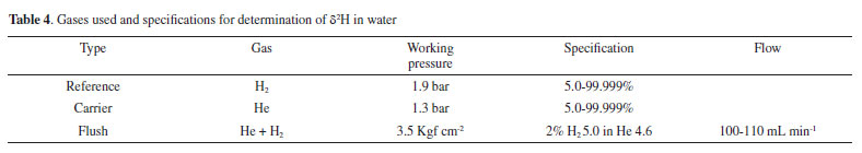 Determination of δ2H in waters at LGI The method applied in this study involves the H2 - H2O equilibrium and the equipment used is the Isotope Ratio Mass Spectrometry (IRMS) - Delta V Advantage - GasBench II, from Thermo Fisher Scientific®. Table 4 shows the specifications of purity, working pressure and gas flows used for the determination of δ2H analysis in water.