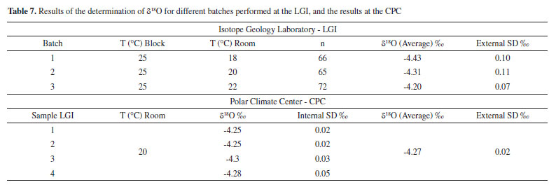 DISCUSSION The implementation of analytical methods is important in the search for reliable analytical results. Effectiveness of methods produces standard operating procedures that incorporate a set of instructions for performing a measurement and defines parameter values that must remain stable during the analysis process and that can be used for interlaboratory studies.28 Precision measures (repeatability and reproducibility) and linearity are important parameters for a method evaluation. Linearity is an important factor for measurements over a concentration range and is generally not quantified but verified, and can be corrected by using calibration functions or by choosing a narrower concentration range.17 The main measures of accuracy estimated within a laboratory or by interlaboratory studies include: the standard deviation of repeatability and reproducibility.14-18,28,29 These are important parameters, as they identify counter effects that need to be eliminated before the analysis, either by modifying the method, or by reducing the variation caused by the effect. For example, the minimization of these effects is done by establishing a control range, specifying a certain operating temperature or temperature range that reduces the variation.28 Temperature is one of the critical factors for isotope analysis of oxygen and hydrogen by the equilibrium method. Temperature variations influence the stability and linearity of the IRMS, impairing the focus of the beams, causing ion deviations in the collectors.10 Furthermore, the stability temperature for determination of δ18O and δ2H by the equilibrium method is ± 0.1 °C, since the fractionation resulting from the temperature oscillation is approximately 0.2%/°C for oxygen and 6.0%/°C for hydrogen.21,24,26 Thus, maintaining the laboratory's ambient temperature constant is required.10 Considering the results obtained under three different conditions (18 °C, 20 °C and 22 °C) of laboratory ambient temperature, no significant variation was observed in the external standard deviation for the oxygen data (Table 7 and Figure 3). Therefore, regardless of the ambient temperatures used in this study, the three batches analyzed, in general, met the external deviations of the manufacturer's specification (≤ 0.10%). The fractionation was far below what would be expected for a temperature variation of 4° C (18 °C-22 °C). If the autosampler tray did not remain with a stable temperature during the analyses the oxygen results would tend to fractionate 0.8%. Thus, the ambient temperature variation did not interfere significantly for the oxygen analyses. Furthermore, the average δ18O results of all analyses (-4.31%), at different temperatures, reproduces the results obtained by the Polar Climate Center (average δ18O at 20 °C = -4.27%) (Table 7), with a slightly difference of only 0.04% among these mean values. Thus, the method used in the LGI, in addition to presenting repeatability, proved to be reproducible, since the analyses performed presented results statistically consistent with those performed under different conditions, such as laboratory, equipment, operator, procedures, method, observer, instrument, conditions of use, location and time.15,28 It is important to highlight also that results were satisfactory at the different ambient temperatures analyzed and the average result of batch 2 was the closest to the average result analyzed by the CPC (Table 7). Although the results of batch 3 were statistically more accurate, the average result was less accurate (Table 7). From these data, we can consider that the optimal working ambient temperature (the best balance between repeatability and reproducibility) was 20 °C, in agreement with the manufacturer's guidelines.25 Considering the results obtained under three different conditions (18 °C, 20 °C and 22 °C) of ambient laboratory temperature, a significant variation was observed in the results of the hydrogen analysis of batch 4 (Table 8, Figure 4). This variation resulted in an external standard deviation of 2.95%, a value higher than that recommended by the equipment manufacturer (external SD ≤ 2% for hydrogen isotopic analysis), and internal deviations, for some analyses, above 1%, values also higher than recommended by the manufacturer (internal SD ≤ 0.4%).25 However, the average value of δ2H of batch 4 was the closest to the average value of all analyses performed at different temperatures (average δ2H of batches = -20.75%) (Table 8). The average δ2H value of batch 6 (-21.61%) is the most negative among the batches and the external standard deviation showed a satisfactory result (2.04%), considering the manufacturer's recommendation. The internal standard deviation of the individual analyzes presented, in general, satisfactory results, despite presenting values greater than 0.4% for some samples. The average δ2H result from batch 5 was the most positive among batches (-19.82%). In addition, it presented the lowest external standard deviation (1.04%) and the lowest internal standard deviations considering the individual analyses (≤ 0.4%). Also, the average result of batch 5 was the closest to the average result analyzed by the CPC (Table 8, Figure 4) with a difference of 0.56%. Thus, the optimal working ambient temperature, that is, the one that resulted in the best balance between repeatability and reproducibility of the data, was also 20 °C, in agreement with the manufacturer's determination.25 Even though the results of batch 4 were discrepant in relation to the other batches, the fractionation was far below what would be expected for a temperature change of 4 °C (18 °C-22 °C). For this temperature variation, the hydrogen results would tend to fractionate 24% if the autosampler temperature did not remained stable, since the expected fractionation is 6.0%/°C for hydrogen.26 Thus, the results showed that the method used in the LGI for determining δ2H, in addition t