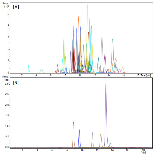 ![]() Figure 1. Extracted ion chromatogram corresponding to the analysis of a natural grape juice extract spiked at 100 µg L-1 in positive (A) and negative (B) ionization modes