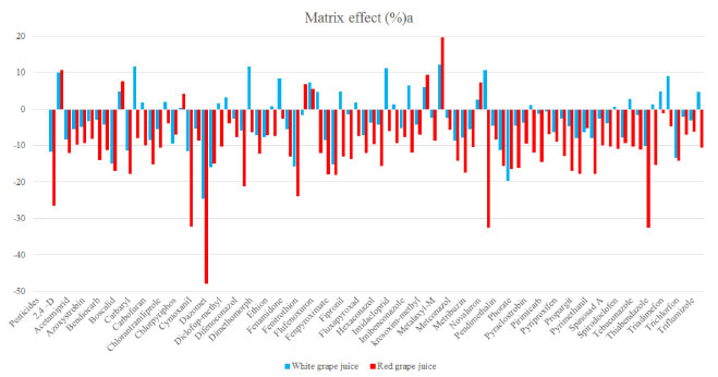 Matrix effect Method validation also included an evaluated of the matrix effect, as signal suppression or enhancement as a result of this matrix effect can severely compromise not only the quantitative analysis of compounds, but also method accuracy and reproducibility.33 Matrix effects depends on various factors, such as the nature of the pesticide, the type of matrix and the pesticide to matrix ratio, in addition to matrix components that can inhibit or enhance the analyte signal.34 In the present work, two grape juices were selected for the evaluation of matrix effects, analysing standards of different concentrations both in pure solvents and in the selected matrices, and comparing the slopes of the calibration curves. Values ranging from -20% to 20% are in signal decrease/increase, from -50% to 20% and 20% to 50% an average effect, and values above 50% or below 50% a strong signal matrix effect.35Figure 2 shows the percentage of signal suppression or enhancement for the two juice types evaluated by LC-HRMS. It can be observed that only the pesticide 2.4-D, cymoxanil, dazomet, dimethoate, fenitrothion, parathion-methyl and thiabendazole pesticides had an average effect in relation to the matrix effect for red grape juice, and only dazomet showed an average effect when the matrix was white grape juice. White grape juice thus presented the lowest matrix effect, as 99% of compounds were unaffected. This results validated the dilution of the samples and the use of high sensitivity equipment. Thus, no significant difference between the different matrices was observed, suggesting that the use of matrix-matched calibration provides sensible quantitation for fruit juice pesticide analysis.