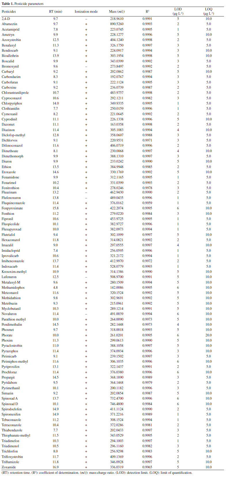 Departamento de Tecnologia, Universidade de Caxias do Sul, 95070-560 Caxias do Sul, RS - Brasil Recebido em: 09/09/2022 *e-mail: sidnei.moura@ucs.br Grapes are among the most widely cultivated fruits in the world, with the majority of Brazilian production focusing on natural grape juice. In this work, a total of 40 samples of 2 types of natural grape juice were analyzed for the presence of 86 pesticide residues, with multiresidue extraction based on modified QuEChERS, by liquid chromatography with high-resolution mass spectrometry (LC-HRMS). Limits of detection and quantification were below 6 µg L-1 and 20 µg L-1, RSD < 20%, R2 > 0.99 and recovery ranged from 80 and 120%. Thus, the developed method was validated and good performance characteristics such as linearity, trueness, repeatability and inter-day precision were obtained. As results, 7 pesticides were detected in real samples (azoxystrobin, benalaxyl, carbendazim, tebuconazol, thiophanate-methyl, pyriproxiphen and pyrimethanil). The method was successfully validated for simultaneous evaluation of 86 multiclass pesticides residues levels, which was applied in 40 natural white and red grape juice market samples. The limits of quantification (LOQs) were low enough and the method was tested on samples showing its applicability, and therefore, this method can be used in routine analysis. Also, this work therefore also serves as an alert regarding the contamination of processed products. INTRODUCTION Grape is the 5th most consumed fruit in the world, behind banana, watermelon, apple and orange. In Brazil their consumption and processing have increased by 134.3% and 236.9%, respectively, since 2016.1 Natural grape juices possess the highest nutritional value of all processed grape products, acting as a mineral source.2 As such juices are produced without fermentation or even sometimes dilution, the monitoring of levels of pesticide residue in these products is essential.3,4 For natural food, government agencies establish maximum residue limits (MRLs) that aim to ensure the safety of consumers;5,6 however, for processed products MRL established for fruits are usually used. For grapes, these values are in the range of 0.5 to 6.0 mg kg-1. In Brazil, these limits are set mainly by the National Health Surveillance Agency7 and the Ministry of Agriculture, Livestock and Food Supply.8 Despite the wide use of pesticides in viticulture, the environmental concentrations can be very low, depending on the type of pesticide used, the degradation process and climatic conditions.9 Accurate determination of pesticide residue levels thus requires the use of sensible analytical methods, most such procedures involve the use of extraction techniques, followed by purification, clean-up and chromatographic analysis. According to the literature, traditional methods of extraction, such as liquid-liquid, are giving way to solid-liquid extractions due to their simplicity and robustness.10-13 In relation to extraction methods, the QuEChERS (Quick, Easy, Cheap, Effective, Rugged, Safe), stands out as being quick and easy to prepare, essentially involving extraction, purification and clean up.14 The versatility and ease of adaptation of this methodology in relation to type of array has also contributed to its widespread use. In addition, preparation involving QuEChERS is often followed by chromatographic analysis. Another important step in the development of new methodologies is validation to ensure that the method is able to offer sensible results for the analysis in question.15-16 This step focuses on determining parameters such as selectivity, linearity and limits of detection, as well as quantification, precision and accuracy.17 Chromatography coupled with mass spectrometry has proven to be one of the most important techniques employed for pesticide analysis in a wide range of matrices.18-23 Liquid chromatography, however, is considered more comprehensive regarding the analysis of both matrices and analytes, and has been widely used coupled to mass spectrometry.24-28 Indeed, chromatographic separation systems coupled to accurate high-resolution mass spectrometry (HRMS) are increasingly being incorporated into the routine work. Nevertheless, few studies have examined the performance of different analytical methods using HRMS for the determination of pesticides in natural grape juice. For instance, Munaretto et al.,29 detected pesticide residues in apple, pear and grape juices using LC/Q-TOF. In order to guarantee the quality of natural grape juices available in Brazil, the present work aimed to optimise and validate a procedure for the quantitative determination of 86 pesticide residues. This study was also designed to contribute to the confirmation of pesticide residue by LC-HRMS, a technique that has not yet been carefully studied regarding the determination of a wide range of pesticides. Selectivity and accuracy for this matrix were assured by method reproducibility confirmed based on the determination of validation parameters, using of HRMS in ESI ionization mode.