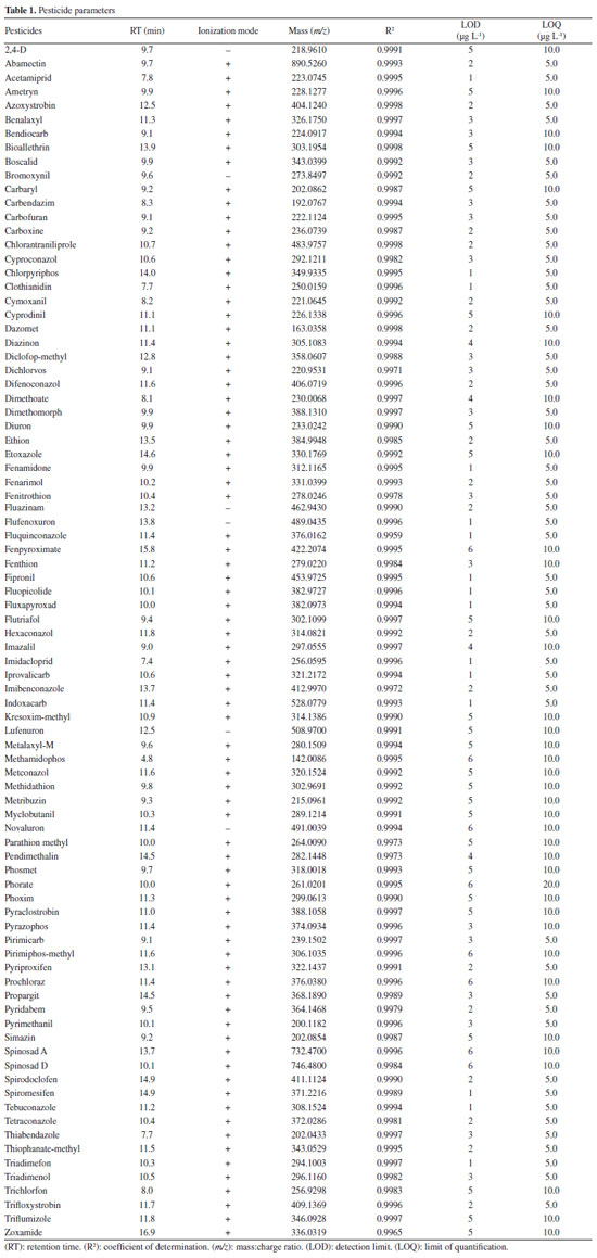 MATERIALS AND METHODS Chemicals and reagents Pesticide analytical standards of high purity (> 98%) were purchased from Dr. Ehrenstorfer (Augsburg, Germany) and Sigma-Aldrich (Steinheim, Germany). Individual pesticide stock solutions of all compounds (1000 mg L-1) were prepared in acetonitrile or methanol and stored at -5 ºC in the amber bottles. Acetic acid, formic acid and ammonium formiate were purchased from Sigma-Aldrich (Steinheim, Germany). HPLC-grade acetonitrile and methanol solvents were supplied by Merck (Darmstadt, Germany). Ultra-pure water obtained from Milli-Q-Plus® system (Millipore Reference Model, USA) was used throughout the study. Sample preparation Two different types of natural grape juice samples (pesticide-free - organic accreditation) were used for method development and validation, both produced in the southern brazilian state of Rio Grande do Sul. After validating the method, forty samples of varying brands and types of white and red natural grape juice, produced in the Rio Grande do Sul were analyzed, were acquired from supermarkets over a period of six months. All samples were stored at -5 ºC, in their original packaging under the recommended conditions until analysis. Extraction procedure Extraction was carried out based on Anastassiades et al.14 with QuEChERS modified. A representative 10 mL aliquot of sample (previously homogenised) with 10 mL of acetonitrile with 0.1% acetic acid was placed in a disposable screw-capped polypropylene tube and shaken for 1 min manually. Thereafter, 4.0 g of magnesium sulfate and 1.7 g of sodium acetate were added, shaken 1 min and centrifuged at 4000 rpm for 8 min. 1 mL of the supernatant was removed and placed in a 15 mL falcon-type tube, added 100 mg of magnesium sulfate and 20 mg of primary secondary amine (PSA) and again centrifuged at 4000 rpm for 5 min. After the extraction process, a supernatant aliquot of approximately 1000 µL was filtered and diluted (50:50) in methanol for injection into the LC-HRMS system. LC-HRMS analysis Liquid chromatography tandem mass spectrometry of high resolution, in positive ESI(+) and negative ESI(-) ion mode was used to separate, identify and quantify the target compounds. LC separation was conducted using a Shimadzu (Kyoto, Japan) instrument equipped with LC 20AD and pumped with auto sampler SIL-20AXR, SPD-20 detector, form CTO-20. The analytical column employed was a RP-18 of 150 mm × 4.6 mm and 5 µm particle size (Agilent Technologies). A binary gradient was used, started at 75% of the mobile phase A, constant for 2 min, followed by a linear increase of 5% A over 7.5 min, constant for 3.5 min and ending with 75% A constant for 7 min. This total 20 min run time. The mobile phase A contained pure water with 5 mmol L-1 ammonium formiate and 0.1% formic acid, and phase B contained pure water with 5 mmol L-1 ammonium formiate and methanol with 0.1% formic acid (1:9). The flow rate was set constant at 0.5 mL min-1 during the whole process and the injection volume was of 5 µL. For the mass spectrometric analysis, a quadrupole-time of flight system Bruker, Q-TOFII® (Billerica, USA) was used, set with the following parameters: electrospray ionization (ESI) voltage: 4500 eV, nebulisation gas flow: 3 L min-1, drying gas flow: 15 L min-1, interface temperature: 250 ºC. Nitrogen was used as the nebuliser and collision gas. Validation parameters Method accuracy and precision were evaluated by recovery studies using blank matrices of the studied two types grape juice samples spiked at three concentration levels, 10 µg L-1, 100 µg L-1 and 200 µg L-1. All experiments were tested with six replicates for each matrix, in accordance with SANTE/11813/201716 and INMETRO (National Institute of Metrology, Quality and Technology) DOQ CGCRE-008.15 Compounds quantitation in the spiked samples were carried out by comparing of the samples with those of matrix matched standard solutions (calibration curves). These, as well as the matrix-matched calibration curves, were prepared by spiking an aliquot of the blank extract with the desired amount of standard solution. LODs and LOQs were evaluated based on the analysis of low concentration standards, in methanol. LODs were established as the minimum concentration at which the signal was detected by the software (Compass DataAnalysis 4.3.110) for the characteristic ion ([M + H]+ or [M - H]-) with a mass error lower than 5 ppm.16 LOQs were established as the lowest concentration tested providing acceptable recovery (between 70 and 110%) and precision (RSD lower than 20%). Linearity was evaluated both in solvent and matrix, using matrix-matched calibration curves prepared in methanol in the concentration range of 0.5-200.0 µg L-1 (n = 7). The matrix effect was studied by comparing the slopes of the calibration curves in solvent and matrix. The repeatability of the instrumental method was estimated by determining the inter-day and intra-day relative standard deviation (RSD < 20%) by the repeated analysis of a spiked matrix extract at 10, 100 and 200 µg L-1 level, from run-to-run over one day and three days, respectively.