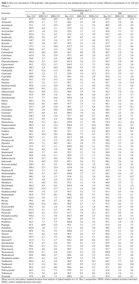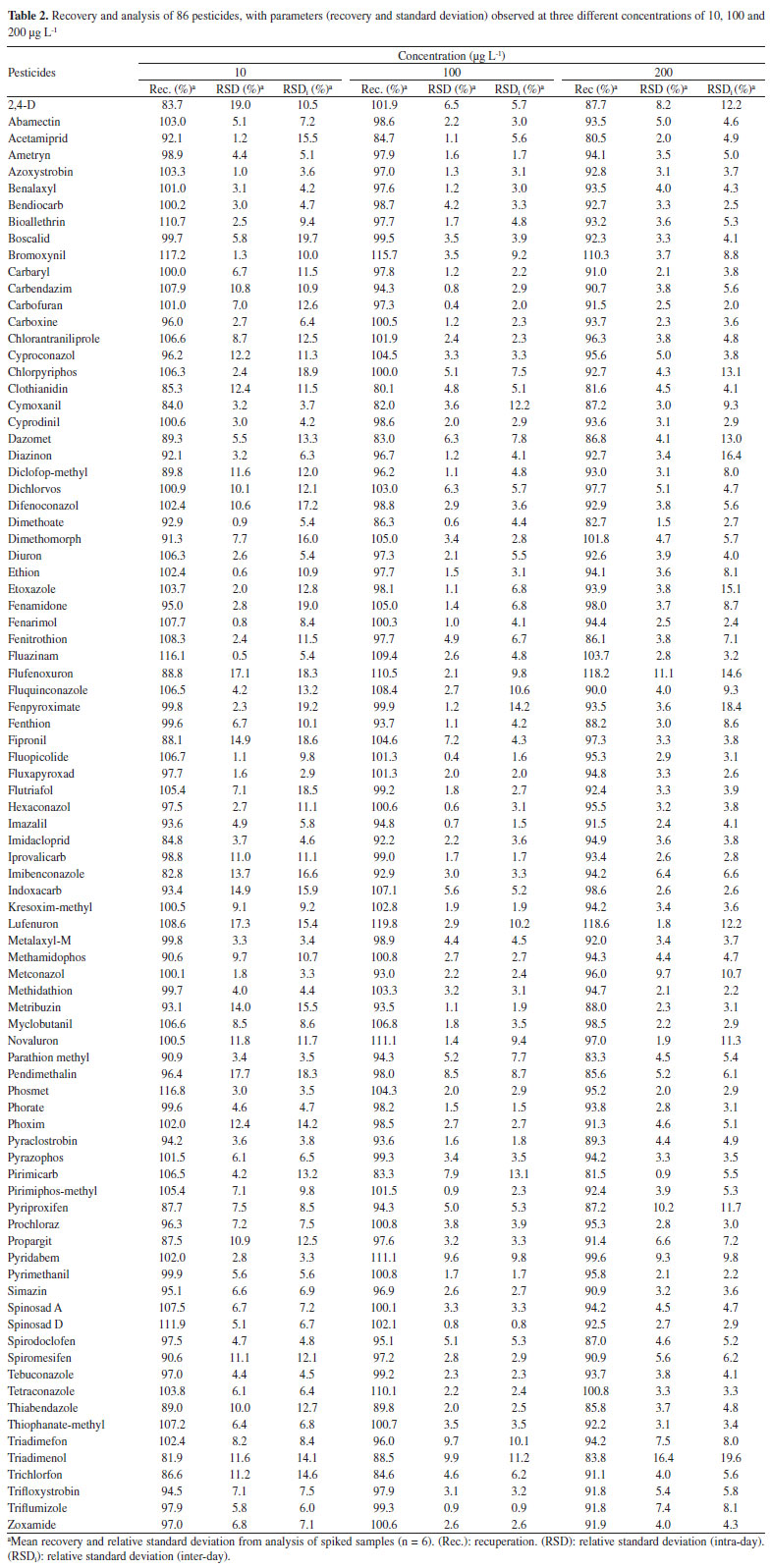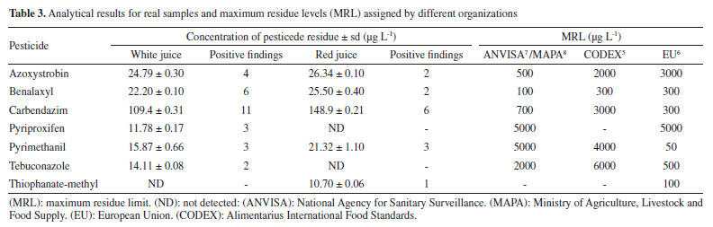 Analysis of the obtained limits data shown in Table 1 reveals that good results were achieved, with LOD and LOQ values lower than 6 and 20 µg L-1, respectively. Survey of the studied pesticides in natural grape juice samples The validated analytical methodology was then applied to analyse forty samples of natural grape juices obtained from local supermarkets in Caxias do Sul, southern Brazil, over a period of six months. Internal quality control was applied to every batch of samples, including matrix-matched calibration, a reagent blank, matrix blank and a spiked blank sample in order to evaluate the stability of the proposed method. In order to prove the effectiveness of the validated method and its suitability for routine analysis, it was applied to real samples. The results of grape juice analysis are displayed in Table 3.