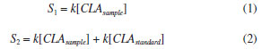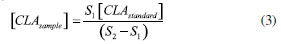 EXPERIMENTAL Reagents and solutions The analytical grade reagents and solvents, such as methanol, hexane, isopropanol, acetic acid, anhydrous sodium sulfate, sodium hydroxide, sodium methoxide solution and the FAME mix were all purchased from Sigma-Aldrich (St Louis, MO, USA). The standards mixture from BASF (BA, Brazil), containing methyl palmitate (C16:0 ME), methyl stearate (C18:0 ME), methyl linoleate (C18:2 ME), and CLA isomers (cis-9, trans-11 and trans-10, cis-12) were kindly provided by EMBRAPA (MG, Brazil). Water was purified by deionization using the Milli-Q system with a resistivity of 18.5 MΩ cm. Individual solutions of FAME were prepared by dissolving appropriate amounts in hexane at a concentration of 1.0 mmol L-1. All solutions were stored in a freezer at -4 ºC until analysis. GC-FID instrumentation The analysis of the FAME was performed on a GC-2010 Plus gas chromatograph from Shimadzu (Kyoto, Japan), with auto-injector AOC-i-20 and detection by flame ionization (FID). Two fused silica capillary columns were used, one with polar stationary phase (CP-Sil88 for FAME; 100 m × 0.25 mm × 0.2 µm) from Agilent Technologies (Palo Alto, CA, USA) and another with ionic liquid (SLB-IL111; 15 m × 0.10 mm × 0.08 µm) from Supelco (Bellefonte, USA). The chromatographic conditions for CP-Sil88 column were described by Cruz-Hernandez et al.8 For the SLB-IL111 column, the analytical conditions were adapted from Delmonte et al.7 and set as follows: injection volume of 1.0 µL in split mode with a ratio of 1:100; injector and detector to 250 ºC; flow rate of carrier gas (H2) of 1.0 mL min-1; linear velocity of 26 cm s-1 and isotherm at 168 ºC. The compounds were identified by co-injection of standards and by comparison of the retention time of a standard mixture. The FAME composition was determined by the standard addition of the individual's standard solutions and are expressed in g L-1. Samples preparation The samples of raw milk were kindly provided by EMBRAPA. The samples were submitted to the lipid extraction and transesterification procedures. In the lipid extraction procedure was used hexane and isopropanol as the organic phase.20 The solvents were evaporated in nitrogen flow until only the lipid phase remained in the test tube. Samples were prepared and analyzed in duplicate. For alkaline transesterification catalysts, sodium methoxide in methanol was used. The samples were transferred and stored in a capped vial in a freezer at -20 ºC until analysis.21 Procedure for quantification Quantification by single point standard addition (SPSA) method, based on equations (1) and (2), was performed in the trials with both chromatographic columns specified in the section GC-FID instrumentation. This approach is suitable for milk samples because it considers the matrix effects and uses only two injections to determine analyte concentration.22,23 ![]() S1 is the analyte signal within the sample chromatogram; k is a constant of proportionality; [CLAsample] is the concentration of analyte in the sample; S2 is the analyte signal in the solution containing both sample and standard, and [CLAstandard] is the concentration of the added standard in the sample. Two solutions were prepared, the first one containing only the extracted sample (920 µL of sample + 80 µL of hexane) and the second containing the extracted sample and standard (80 µL of standard + 920 µL of the sample). By isolating k and equating equations (1) and (2) we have equation (3): ![]() when the concentration of CLA standard [CLAstandard] is 2.7 g L-1 and the volumes used in the dilution are the above volumes, the equation 3 can be rearranged into equation 4, used to calculate the concentration of the CLA in each sample [CLAsample]: ![]()