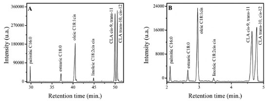 RESULTS AND DISCUSSION Figure 1(A) shows the resulting chromatogram of a CLA standard mixture together with a FAME mix analyzed in a 100 m long CP-Sil88 column with a programmed heating ramp.8 Since traditional FAME mix do not include trans-FA, CLA provides complementary information for full FA profile identification considering milk derivative analysis, therefore, from this analysis, the composition compiling majoritarian FAME and CLA isomers was established. The final mixture was then used as a secondary standard for all subsequent measurements.
