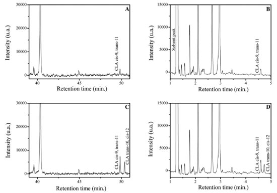 Furthermore, it is not possible to measure by area normalization in this case because some small FAME can coelute with the solvent peak in the proposed method, as will be discussed forward. Figure 1(B) shows the same CLA-FAME mixture analyzed by the proposed method using SLB-IL111 column with 15 m in length and isotherm at 168 ºC. The separation profile is maintained for both analyzes, however, the time spent in the first analysis is about 10 times greater than the second column to separate the isomers of CLA. To evaluate if the FAME-CLA profile would be found in real samples, a milk sample prepared according to the optimized protocol described in the section Samples preparation was injected using both columns (Figures 2(A) and 2(B)). The separation profile of the standard mixture was replicated in the analysis of milk. To finally confirm the identification of the CLA isomer present, the sample was spiked with CLA standards (Figures 2(C) and 2(D)). By comparison of the retention times shown in Figure 1, the CLA isomer within the sample is the cis-9, trans-11. It is noticeable that the proposed method was selective for the rapid separation of the isomers of CLA of interest.