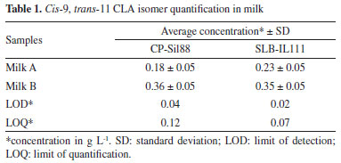CONCLUSIONS By using a column with different SP, it was possible to separate and quantify the CLA isomer cis-9, and trans-11 in milk samples. The main contribution of this proposed alternative method of CLA is the enhanced throughput output when compared to a recommended method due to the reduction of analysis time to obtain the results along with the reduced gas spent. Finally, the proposition made in this work is very compelling and useful to be considered in analytical routines approaching CLA isomer monitoring in laboratories dedicated to this type of analysis.