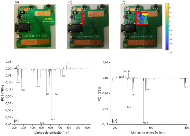 ![]() Figura 1. PCB antes do mapeamento elementar no LIBS (a), após o mapeamento (b), o heat map dos scores (c) da PC1 e para o pulso 5, os loadings da PC1 (d) e pulso 5 e uma ampliação dos valores de loadings para as linhas emissão de 200 a 400 nm (e)