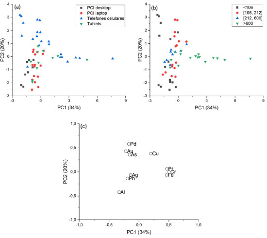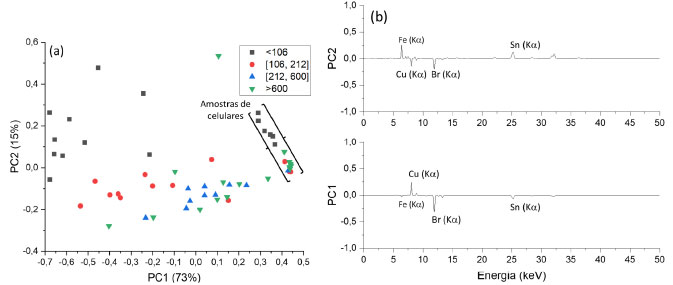 Os espectros de EDXRF foram organizados da mesma forma e foi escolhida a condição (i) alto número atômico e atmosfera de He, como exemplo, para calcular a PCA. O resultado obtido é apresentado na Figura 6, com os scores (Figura 6(a)) e os loadings (Figura 6(b)). Nos scores (Figura 6(a)) houve um leve agrupamento por diferença de tamanho de partícula e foi notado uma anormalidade quanto aos espectros das PCBs de celulares, que se agruparam independente do seu tamanho de partícula. Esse comportamento é devido aos sinais dessas amostras serem muito semelhantes e se destacarem das demais. Nos loadings (Figura 6(b)) os elementos com maiores contribuições foram o Br, Cu, Fe e Sn. O Cu apresentou correlação negativa com os demais elementos, principalmente o Br, como mostra a PC1. Portanto as amostras que estão do lado positivo da PC1 na Figura 6(a) possuem maiores concentração Cu e menores de Br.