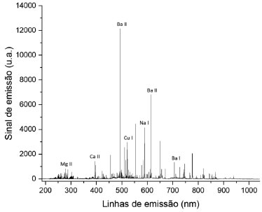 ![]() Figura 3. Espectro de emissão LIBS de uma amostra de celular moída e prensada