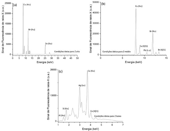 ![]() Figura 4. Espectros de fluorescências de raios-X de uma amostra de celular em atmosfera de He, nas condições (i) número atômico alto (a), (ii) número atômico intermediário (b) e (iii) número atômico baixo (c)