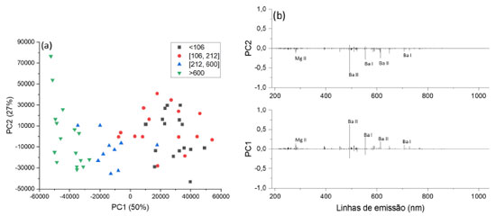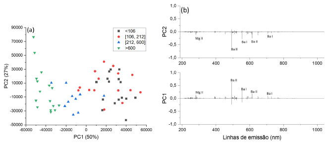 ![]() Figura 5. Scores (a) e loadings (b) dos espectros de emissão LIBS das 57 amostras em função do tamanho de partícula