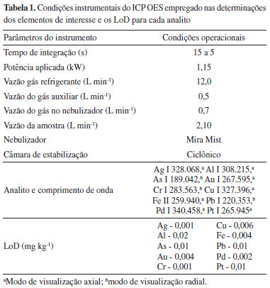 PARTE EXPERIMENTAL Variáveis provenientes de concentrações de elementos químicos Nesta parte do tutorial foram utilizados resíduos eletrônicos (e-waste) compostos por computadores (desktops e laptops), celulares e tablets. O resíduo obtido foi desmontado e segregado em diferentes partes: polímeros, cabos e circuitos eletrônicos (printed circuit board, PCB). O objetivo foi a determinação de analitos, tais como elementos nobres (Ag, Au, Pt e Pd), convencionais ou metais base (Al, Cu e Fe) e potencialmente tóxicos (As, Cr e Pb) nos PCB's. Ao todo foram obtidos dois desktops, quatro laptops, sete celulares e três tablets. As PCB's foram moídas em moinho de facas (Tecnal TE-650, Piracicaba, Brasil), peneiradas e segregadas em quatro diferentes tamanhos de partícula: (i) < 106 µm; (ii) 106-212 µm; (iii) 212-600 µm e (iv) > 600 µm. Ao final do processo de peneiramento foram obtidas 57 amostras. O material foi mineralizado em bloco digestor (Marconi MA4025, Piracicaba, Brasil) com o emprego de água régia diluída 1:1 com água desionizada Milli-Q e frascos fechados de tetrafluoroethylene-perfluoro (alkoxy vinyl ether) (PFA). A temperatura de aquecimento dos tubos foi de 95 oC e o tempo de preparo foi da ordem de 2 horas. O extrato ácido resultante foi diluído para 50 mL com água desionizada e as determinações foram executadas em ICP OES (Thermo Fisher, iCap 7000 series, EUA). A Tabela 1 mostra as condições instrumentais empregadas nas determinações por ICP OES. A acurácia dos dados foi verificada por meio da utilização de uma amostra de referência de e-waste preparada por Andrade et al.18,19 Ao final do processo foi possível obter uma matriz X com 57 amostras (n) e 10 variáveis (m) que representam as concentrações dos 10 analitos determinados. Assim, a matriz X terá a dimensão n:m (57:10).