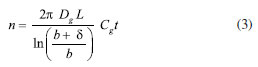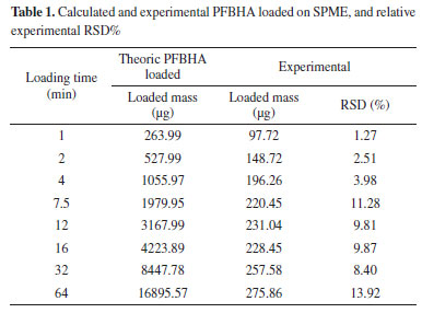 RESULTS AND DISCUSSION Theoretical SR of porous coating used for SPME fiber completely exposed from the needle For a cylindrical open tube, the SR is defined for the analyte in air through Fick's first law of diffusion, as shown in Equation 2: ![]() where Z is the effective diffusion path length (cm), A is the cross-sectional area of the sampling surface (cm2), and Dg is the FA diffusion coefficient in the air (cm2 s-1): Equation 2 provides a constant SR once the molecule, i.e. Dg, and the sampler features, i.e. A and Z, are defined. Dg depends on the molecular weight of the target analyte and temperature. Various models using different predictive variables are suggested to calculate the Dg of FA.36-41 Dg can be obtained from many chemical property's handbooks. US Environmental Protection Agency (EPA) developed a user-friendly online diffusion coefficient calculator.42 This online tool uses Fuller-Schettler-Giddings (FSG), FSG-LeBas, and Wilke and Lee models to estimate the Dg for a chemical based on its molecular structure and boiling point.43 The three models give very close values of Dg for FA, and the average Dg, equal to 0.177 cm2 s-1, was used. The same approach was used for further calculation concerning PFBHA with the average Dg (0.0664 cm2 s-1). With SPME fiber completely exposed is not possible to define Z. So, to calculate theoretical SR using a porous coating, the theory of heat transfer is applied,44 expressed as a function of the quantity of heat that passes through the walls of the tube during a given time (t), defined by Equation 3: ![]() where b represents the radius of the fiber (i.e., 0.013 cm for 65 µm PDMS/DVB), Cg is the nominal concentration of PFBHA (µg mL-1), δ is the thickness of the boundary layer (cm) and t is the loading time (min); this formulation is similar to Equation 2, where Z is replaced by δ. The factors which most affect δ are the linear velocity and temperature of the air, the radius of the SPME fiber, and Dg. The transfer is considered to occur according to conventional principles, but as far as the transfer of the analyte inside the film is concerned, it occurs by diffusion.25 Therefore, the real thickness of δ can be obtained by the laws which rule heat transfer, using the model suggested by Nernst, in which the matrix inside the film is within a coating25 (Equation 4): ![]() where Re (the Reynolds number) is defined as 2ubv-1 (where u is the linear air speed (cm s-1), v the air viscosity, 0.014607 cm2 s-1), and Sc (Schmidt's number) is expressed as vDg-1. Theoretically, linear air speeds higher than 10 cm s-1 yield a δ value closer to zero, so that the effect of the boundary layer becomes negligible and can be considered constant, nullifying Equation 3; moreover, mass transfer results are overestimated.25 Figure 1(1) shows the regression line obtained using heat transfer theory; a linear velocity of 10 cm s-1 was used, with a nominal value of PFBHA concentration in the HS of 30 µg mL-1. The model predicts a linear increase in the adsorbed PFBHA with time without reaching a plateau. However, the number of active sites available for adsorption on the fiber is finite, pointing out a clear limitation when predicting the saturation of the derivatizing reagent loaded.