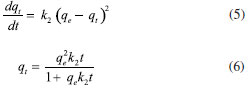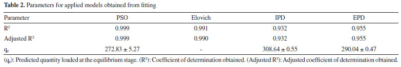 ![]() Figure 3. Elovich model (1), PSO model (2), IPD model (3) and EPD model (4)