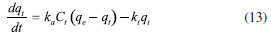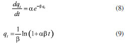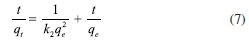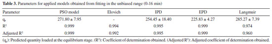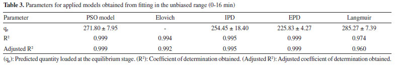 SPME fiber carry-over When using SPME, general drawbacks reducing the performance of the technique are present; one of the most important is fiber brittleness, which can be overcome using commercially available alternatives, such as SPME arrow. Conversely, when using SPME technique in gas chromatographic analysis, more specific problems may occur: among them, carry-over represents an important issue to be addressed, since it impacts the linearity of the response and the LOQ.45,46 It is well known that enhancing the desorption time and the injector temperature can indeed minimize this effect, yet impacting fiber lifetime due to increased coating degradation phenomena (e.g. phase bleeding).47-49 For this reason, SPME fiber carry-over was addressed by sampling and analyzing a known FA atmosphere (1 mg m-3) using derivatized fibers (PFBHA loaded in the 1-64 min time range, as described in the derivatization routine), followed by a second run without performing any preconditioning or bake. In particular, FA-oxime desorption time was investigated at 250 ºC (operating injector temperature) for 1, 3, 5 and 10 min. We observed a total desorption of the analyte for every time setting with no memory effects. Similarly, the derivatized SPME fiber provided negligible carry-over results in the whole range of loaded PFBHA, even before analyte reaction. The results obtained confirmed the suitability of the desorption time chosen, i.e. 1 min. Adsorption kinetic models The complex nature of SPME fibers as sorbent systems requires to consider various limiting factors, to better understand its behaviour in terms of capacity. Different adsorption models are taken into account and applied to experimental data: PSO model, Elovich model, IPD, EPD and Langmuir isotherm model are here presented and their results confronted. Since its introduction in 1996 by Ho et al.,50 several works have used the PSO approach to describe the adsorption process, in order to calculate the adsorption rate constants and to model experimental data. The PSO model and the integrated formulation are reported in Equation 5 and Equation 6, respectively: ![]() where qe represents the adsorption capacity at equilibrium (µg L-1), k2 is the pseudo-second rate order constant (g µg-1 min-1), t is the adsorption time (min), and qt represents the adsorbed amount of analyte at a given time t (µg L-1). However, calculating the model parameters from Equation 6 can be quite trivial; therefore, it is convenient to convert it into a linear form, as reported in Equation 7:51 ![]() Nonetheless, the linearization introduces propagated errors in the evaluation of the model parameters: for this reason, both formulations were applied.52-55 Using the experimental values of qt, converted in absolute PFBHA quantities, the best fitting curve was constructed to extrapolate k2 and qe (converted in µg, also for later applied models), as shown in Figure 2: the parameters derived from software elaboration, including R2, adjusted R2 and qe, are reported in Table 2. The linearized model and the residual plots for both formulations are available in Supplementary Material (Figures 2S-4S). It can be observed that the quantity of loaded PFBHA tends towards a plateau past 32 min, reaching about 276 µg at 64 min; on the contrary, the calculated amount equals 273 ± 5 µg.