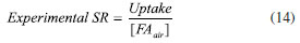The convergence of investigated models, in particular PSO, IPD and Langmuir isotherm, confirms the adsorption at homogenous sites with uniform energy levels: the direct consequence is that the adsorption forms a monolayer of PFBHA on the surface of the fiber. Moreover, the missing convergence of Elovich fitting reinforce this aspect, since previous studies suggested it to be more suitable for heterogeneous sorbent surfaces.57 The effort to define the suitable conditions to load the maximum amount of derivatizing reagent presented so far is something to be dealt with in every concentration range. Despite the amount of PFBHA consumed doing so is enhanced, this operation is necessary to guarantee a complete reaction of the FA, avoiding any mismatch with the effective quantities present. Moreover, as demonstrated in Dugheri et al.,34 the FA blank level of commercial PFBHA is not reducible via further purifications. Thus, a higher mass of derivatizing reagent loaded can maximize the mass of sampled FA, minimizing the impact of the reagent blank. The possibility of limiting the number of tests to be conducted provided by a modelistic approach, as shown so far, represents a powerful tool in terms of cost reduction and effort of compliance with greener approaches. Experimental SR of porous coating SPME fiber completely exposed from the needle Once the SPME system loading was tested and the results confirmed from the adsorption models shown above, experiments were performed to obtain the SR for FA. This evaluation is mandatory in order to predict the best conditions to apply the technique as a passive sampler in different concentration scenarios. Hence, the calibration curve for the airborne concentration of FA (CFAair) in a dynamic system was obtained by permeation tubes, as described in the Experimental section. The experimental SR was obtained by use of Equation 14: ![]() where Uptake (ng s-1) is the slope of the equation of the regression line constructed by correlating the mass of FA chemisorbed on the SPME fiber with the sampling time for a known FA atmosphere (1 mg m-3), as shown in Figure 5 (i.e., 0.29 ng s-1). Every level of the curve was evaluated in five replicates. The absolute quantity of FA was previously calculated as described in the Experimental section. The effect of air velocity on the SPME system was verified using a glass cylinder connected to the exposure chamber characterized by an internal diameter of 2 cm, provided with a plug for the introduction of the SPME fiber, which enables to reach different linear air speeds. The value obtained, about 16 cm s-1, was calculated by dividing the airflow (set at 50 mL s-1) by the cross-sectional area (about 3.14 cm2). In this condition, i.e., above 10 cm s-1, the SR of SPME for FA can be considered constant and independent from the air velocity: the SR obtained experimentally is 17.4 mL min-1, according to the literature data.67