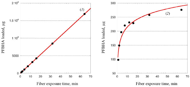 ![]() Figure 1. Predicted PFBHA loaded on SPME fiber by heat transfer theory (1) and experimental PFBHA loaded (2)