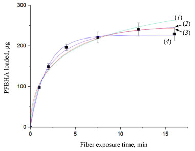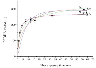 CONCLUSIONS The miniaturization of traditional sample preparation devices fulfills the request of an environmentally friendly analytical chemistry: miniaturized techniques, such as SPME, provide a valuable analytical tool even for the most challenging compounds, such as formaldehyde, reducing the per-analysis time and the cost, while improving analytical productivity. To optimize SPME sampling, a defined knowledge of its sorption kinetic results a crucial information. In this framework, experimental data of loaded PFBHA were fitted using various kinetic adsorption models, observing that PSO was the only model that enabled the prediction of adsorbed derivatizing reagent at equilibrium stage, limiting the tests to be conducted while demonstrating at the same time the complexity of the processes taking place on the fiber. The sampling rate for FA was also determined in our experimental conditions: with these results in hand, it was possible to define the optimal set-up for SPME sampling. In particular, the sampling time represents the most important parameter modifiable, to move towards a trustworthy approach which can be extended to other compounds of environmental interest, reducing pre-analytical uncertainties, such as analyte underestimation.